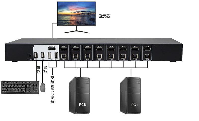 能够使用户从单一USB键盘、鼠标、和一个DisplayPort视频信号接口,快速切换操作8台电脑主机,以便有效率的进行多工作处理;0755 86120002